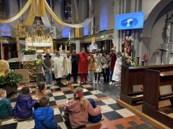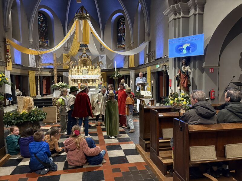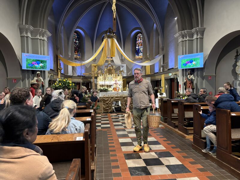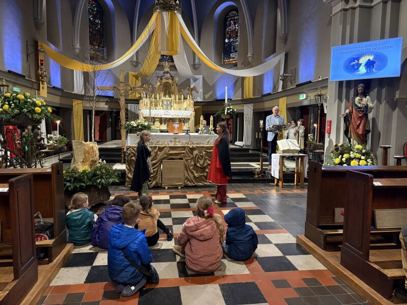 In een mooi versierde kerk werd ook dit jaar weer het paasverhaal verteld door meester Frank Feron en uitgebeeld door de leerlingen van Basisschool De Bolster.