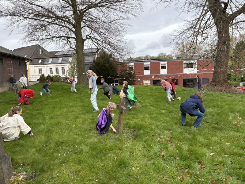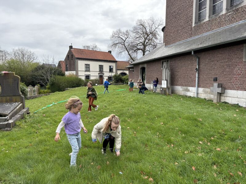 Buiten werd gezocht naar deze (paas)eieren en na verzameling eerlijk verdeeld onder de aanwezige kinderen.