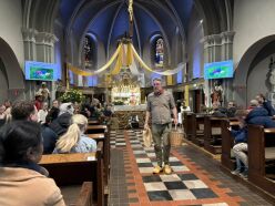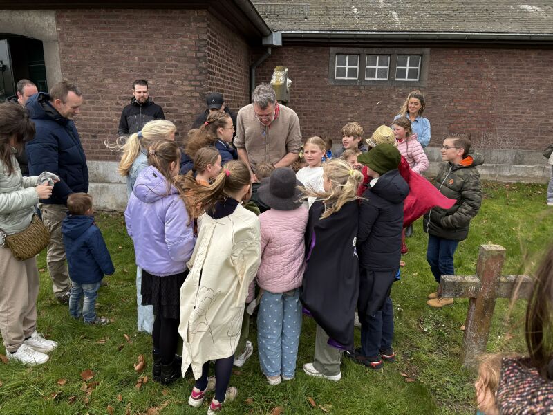 Aan het einde van de mis kwam boer Griffijn een oproep doen aan de kinderen om mee te helpen zoeken naar de eieren van de weggelopen kippen.